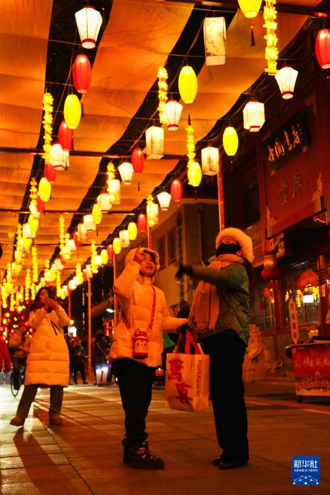 1月22日,行人驻足观看北京琉璃厂西街的彩灯。