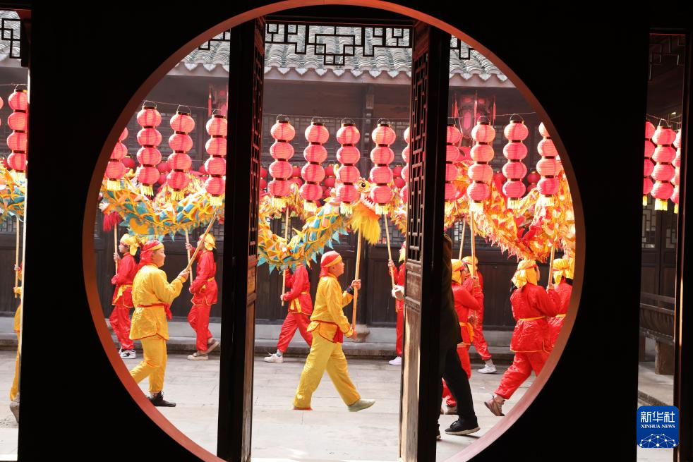 1月22日,在浙江省湖州市德清县乾元镇直街社区新时代文明实践点,乾元镇中心小学学生在舞龙。