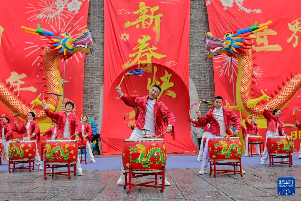 1月21日,民间艺人在湖北省襄阳市唐城景区表演舞蹈。