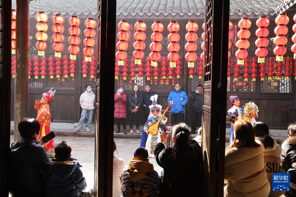 1月22日,孩子们在浙江省湖州市德清县乾元镇直街社区新时代文明实践点表演戏曲。