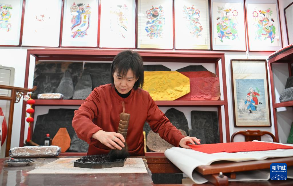 在天津市西青区杨柳青镇玉成号年画坊,玉成号画庄第七代传承人张宏准备印年画(1月20日摄)。