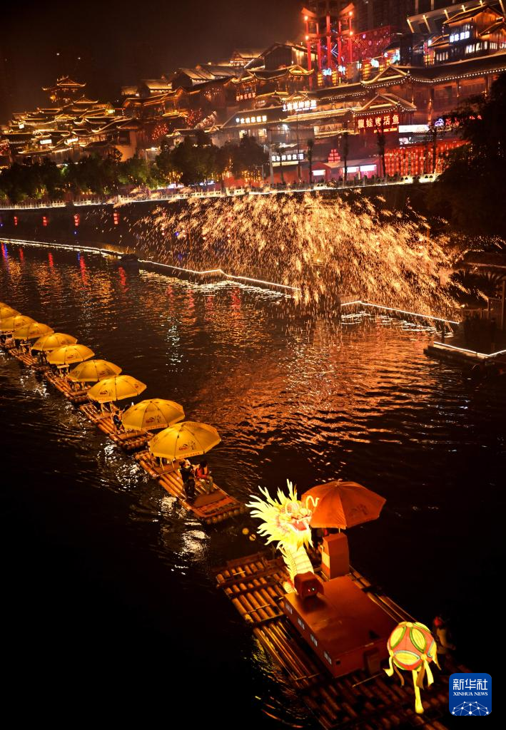 1月22日,民间艺人在湖北省宣恩县贡水河上表演打铁花。