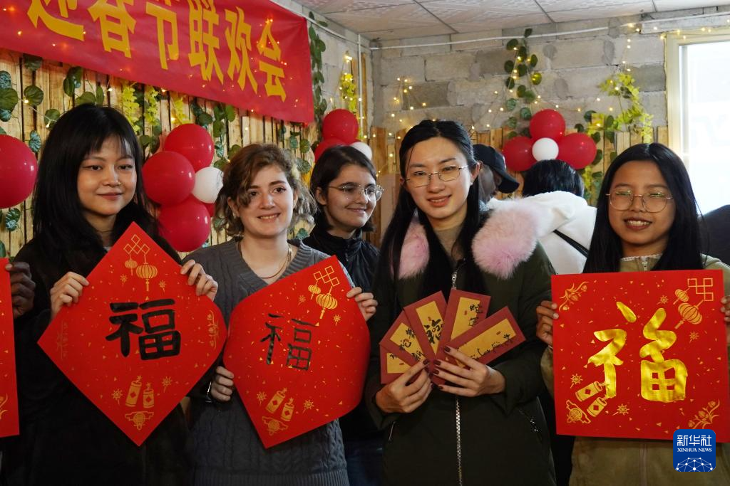 1月23日,在广西桂林市广西师范大学育才校区,外国留学生在中外师生迎新春联欢会上展示自己写的“福”字。