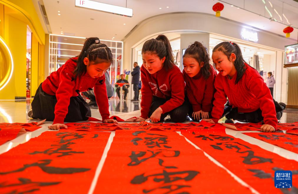 1月23日,在江苏省扬州市江都区,小朋友观看当地书法爱好者写好的春联。