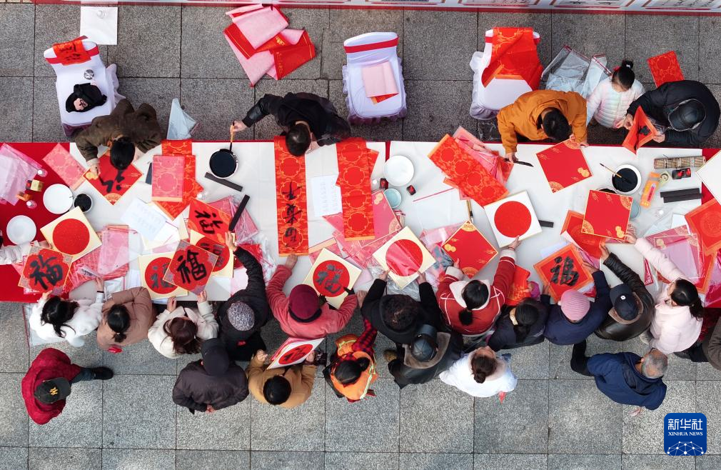 1月23日,湖南省衡阳市衡东县文体广场,书法爱好者为群众书写对联、福字(无人机照片)。