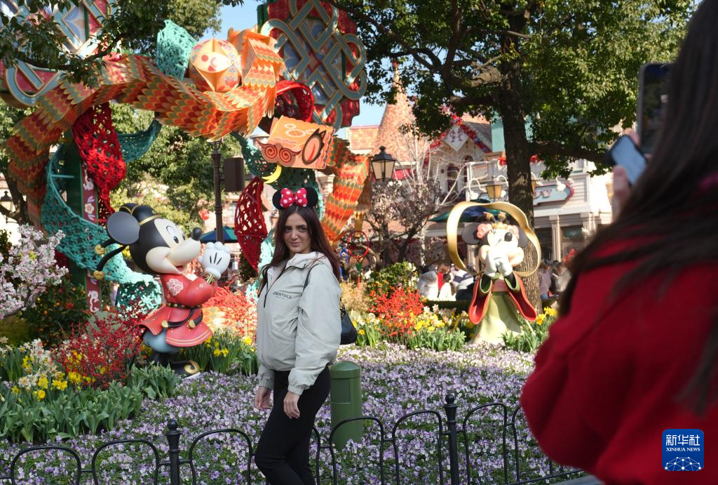 1月22日,游客在上海迪士尼乐园蛇年新春主题装饰前留影。