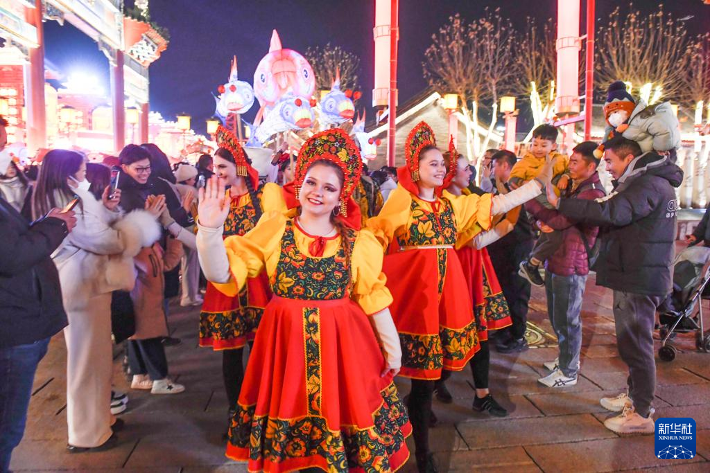 1月22日,外籍演员在河北省唐山市丰南区河头老街景区与中国游客互动。