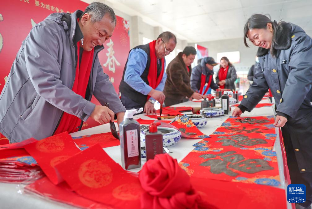 1月23日,在湖南省衡阳市衡东县文体广场,书法爱好者为群众书写对联、福字。
