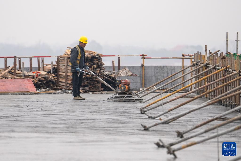 1月24日,在长沙机场改扩建工程T3航站楼施工现场,中建八局工人浇筑混凝土。
