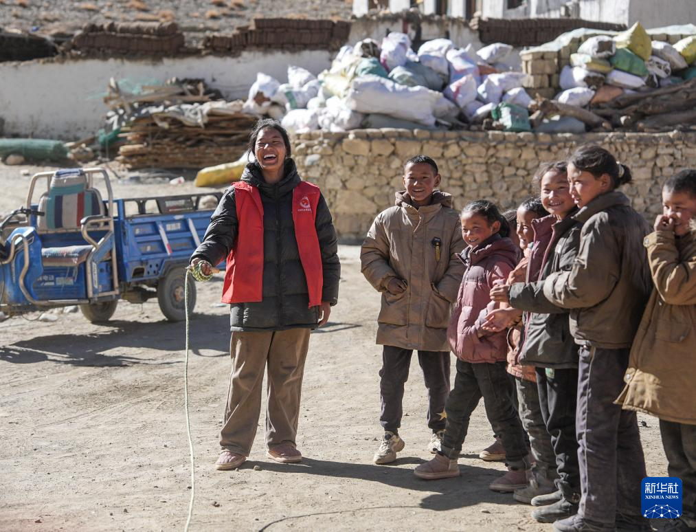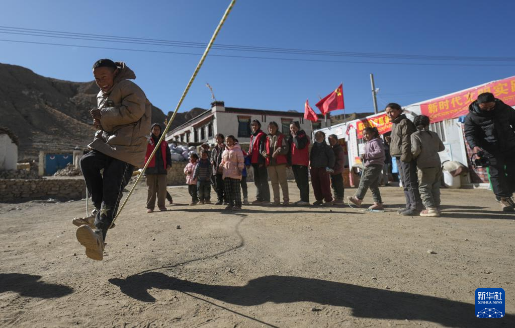 1月25日,大学生志愿者在定日县曲洛乡热木青村安置点和孩子们一起跳绳。