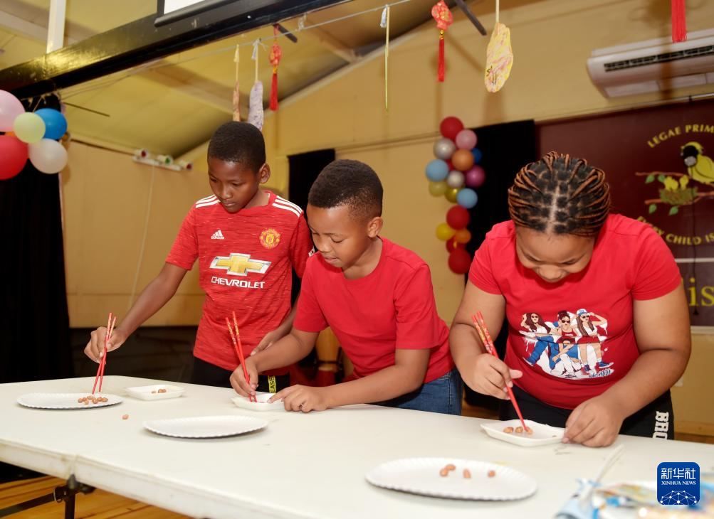1月29日,在博茨瓦纳首都哈博罗内的丽海国际小学,当地学生参加筷子夹花生游戏。