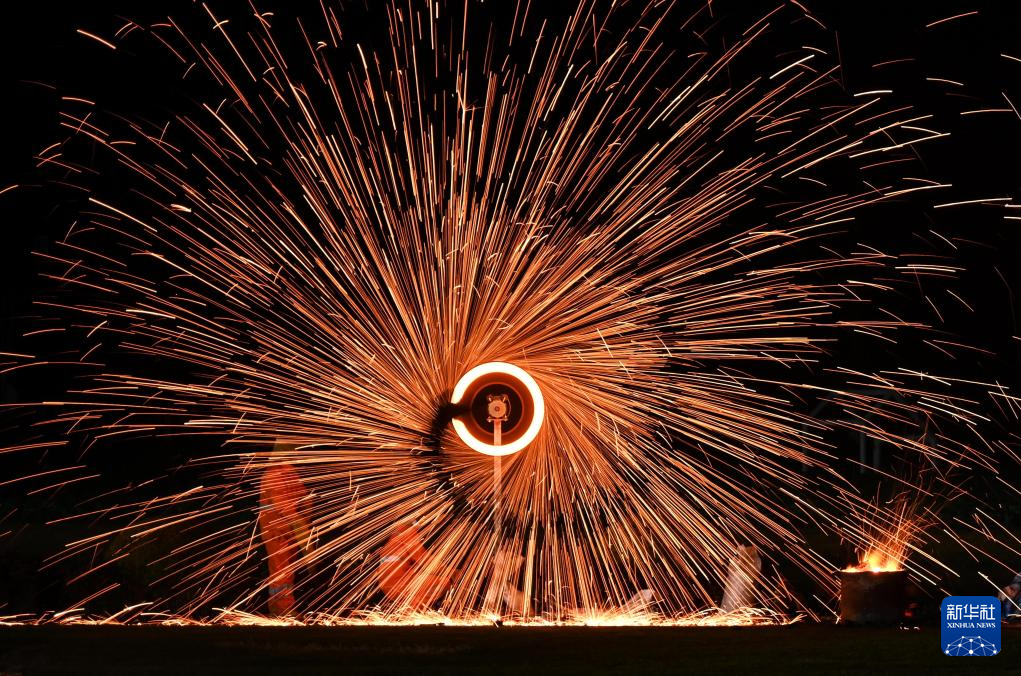 2月1日,民间艺人在浙江省金华市武义县花田美地景区进行非遗火壶表演。