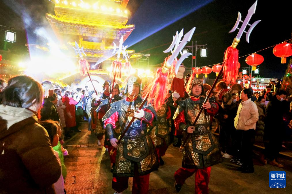 2月1日,游客在甘肃省张掖市甘州府城“丝绸之路·甘州不夜城”活动上观看表演。