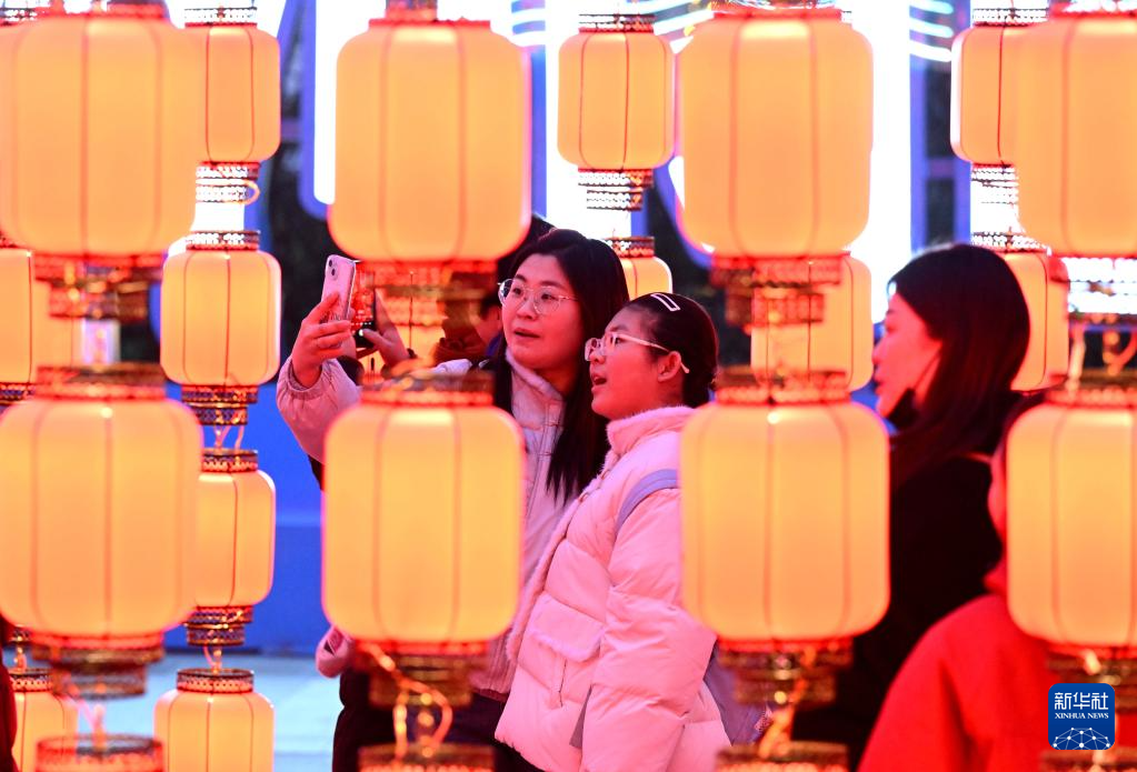 2月1日,游客在河北省石家庄市正太广场赏灯。