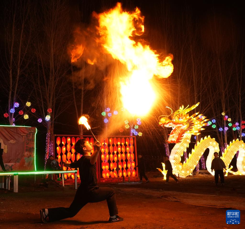 2月1日,民间艺人在河南省开封市尉氏县十八里镇一景区表演气功喷火。