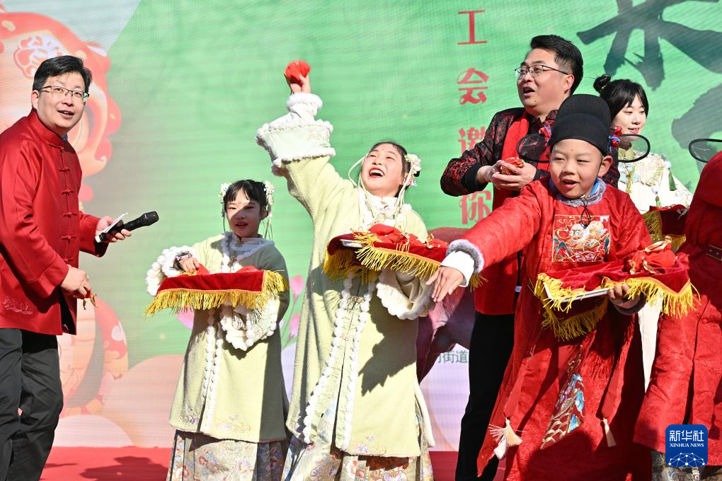 2月3日,“春姑娘”“牛童”和嘉宾向市民抛掷福袋。