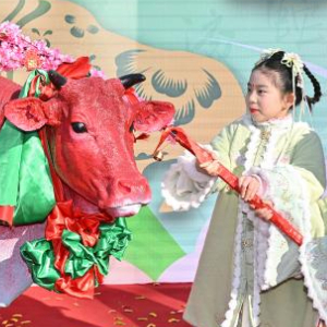 2月3日,“春姑娘”手持花枝轻轻鞭打春牛。