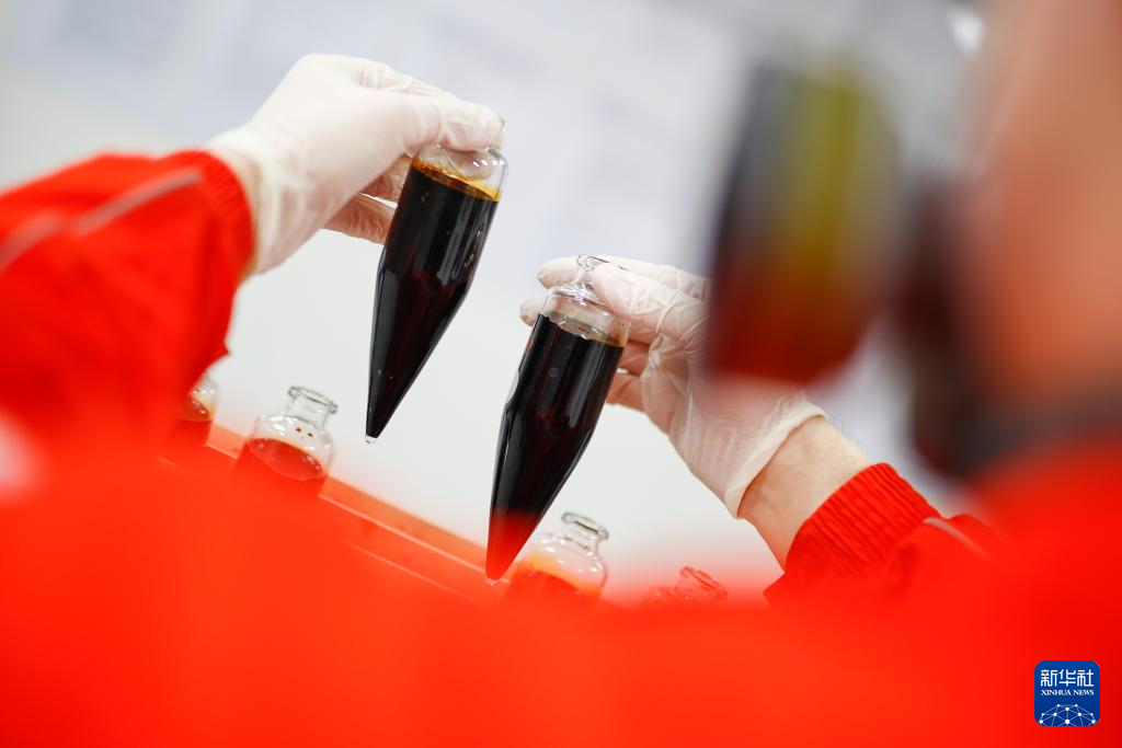 2月8日,工人在渤中26-6油田海上作业平台进行原油化验。