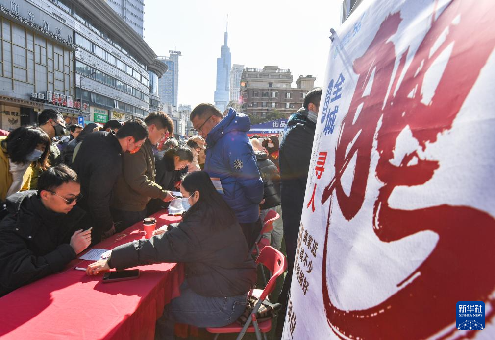 2月8日,求职者在南京市鼓楼区举办的“春风行动”专场招聘会上与用人单位面对面交流咨询。