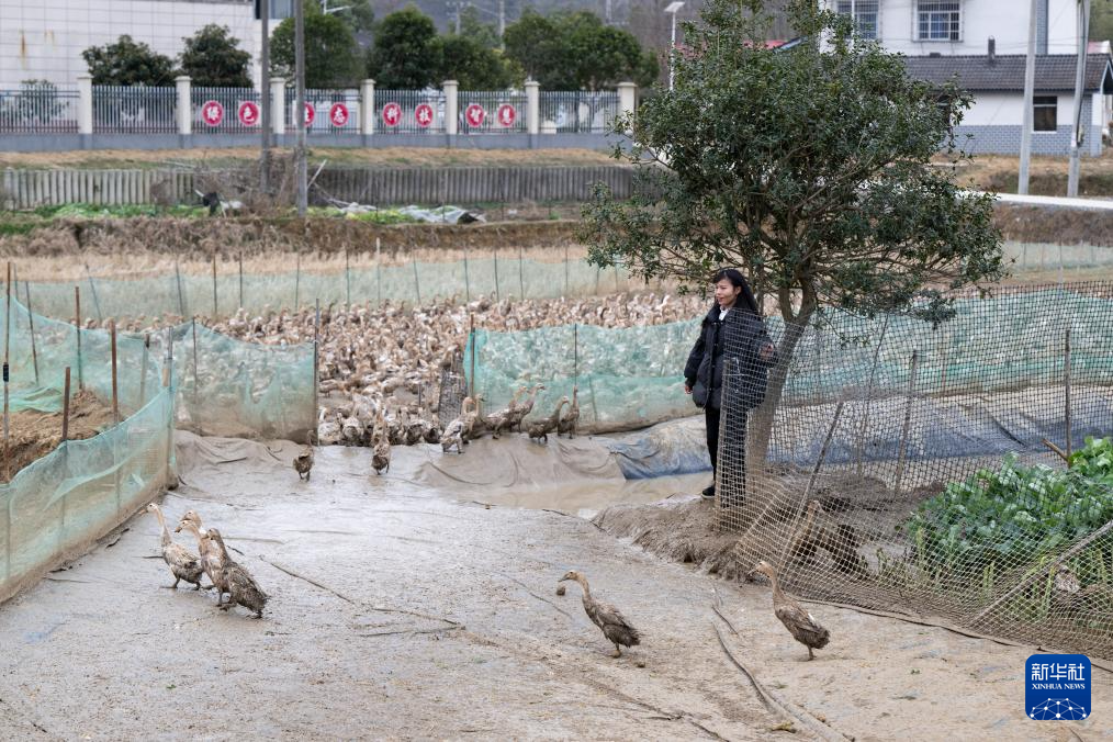 在湖北省赤壁市中伙铺镇安丰村,田淑娴在鸭舍查看鸭群长势(2025年2月7日摄)。