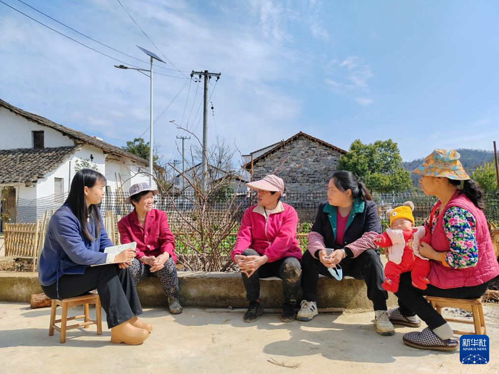 2025年2月18日,在湖北省赤壁市中伙铺镇安丰村,田淑娴(左一)了解村民关于农村医保、养老金使用等情况。