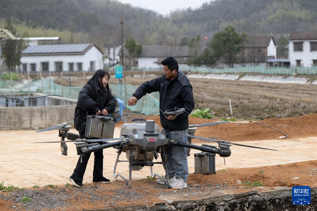 在湖北省赤壁市中伙铺镇安丰村,田淑娴和爱人在田间更换农用无人机电池(2025年2月7日摄)。