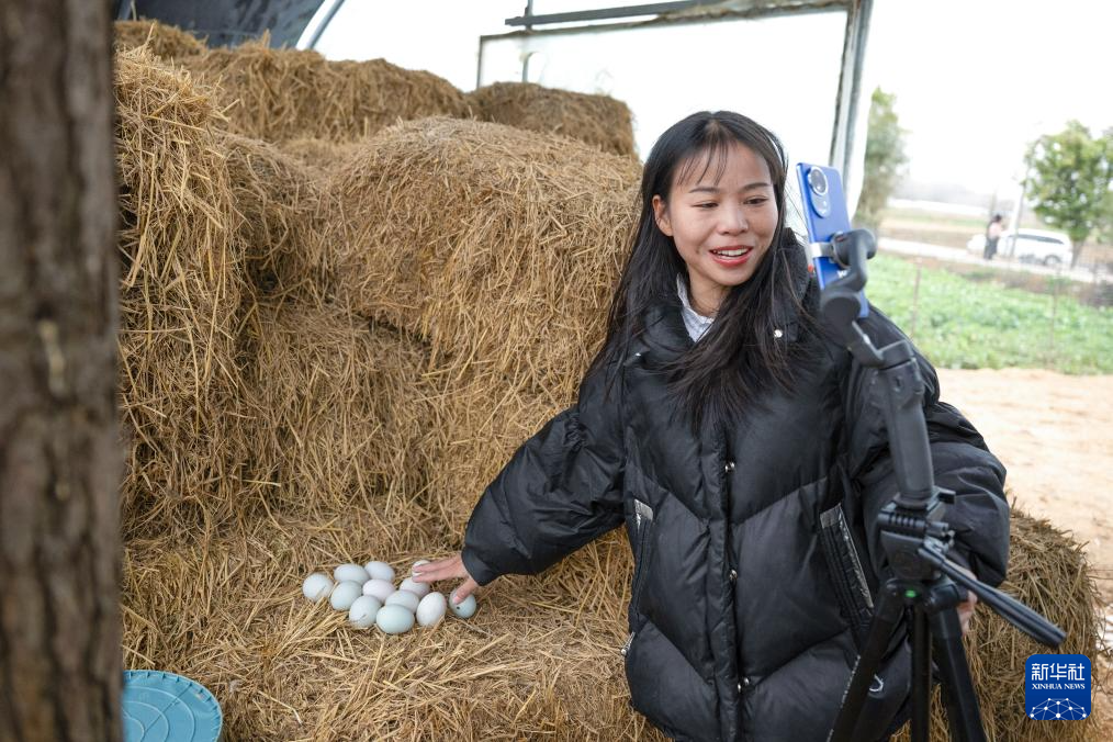 田淑娴在田间进行直播带货,向大家展示村里生产的鸭蛋(2025年2月7日摄)。