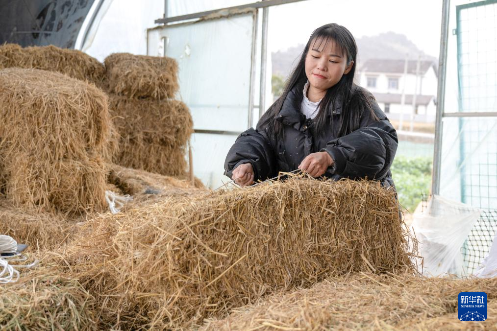 在湖北省赤壁市中伙铺镇安丰村,田淑娴在搬运秸秆草料(2025年2月7日摄)。