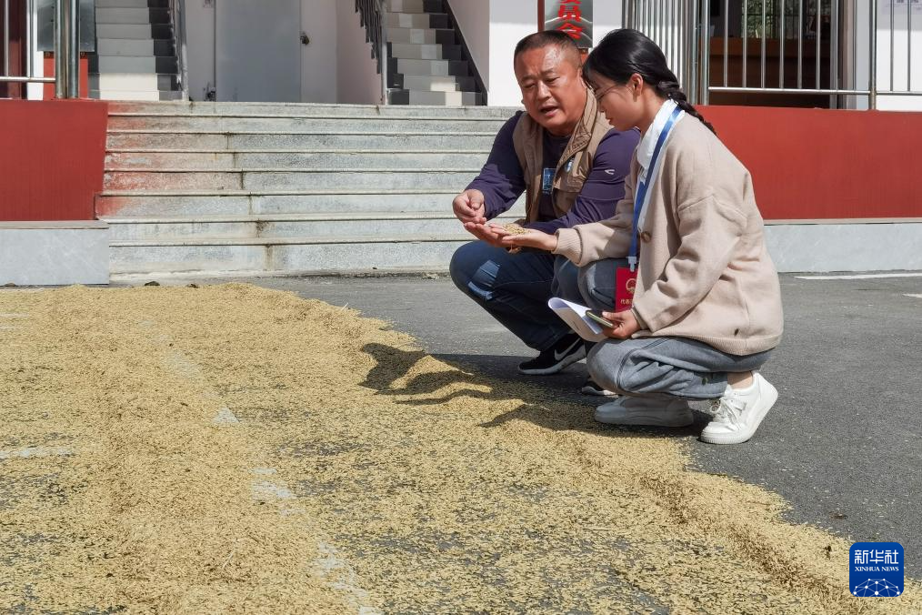 2023年10月20日,田淑娴(右)在湖北省赤壁市中伙铺镇安丰村调研秋粮存储情况。