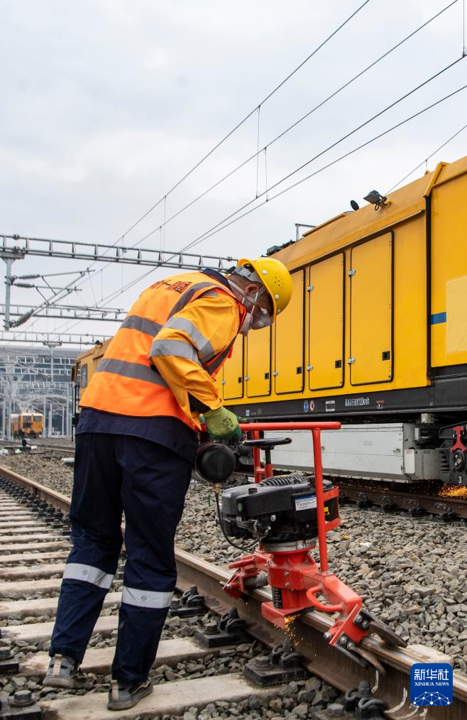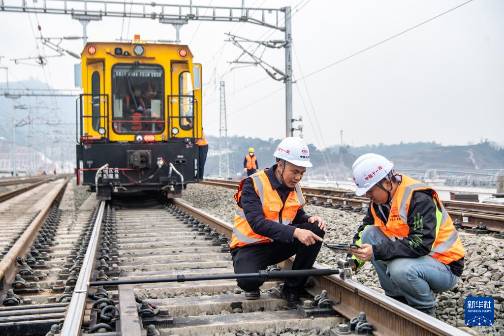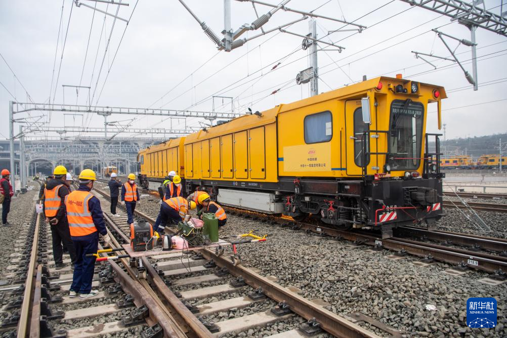 2月18日,在重庆东站建设施工现场,中铁十一局的铁路工人在查看钢轨打磨车的运行状态。
