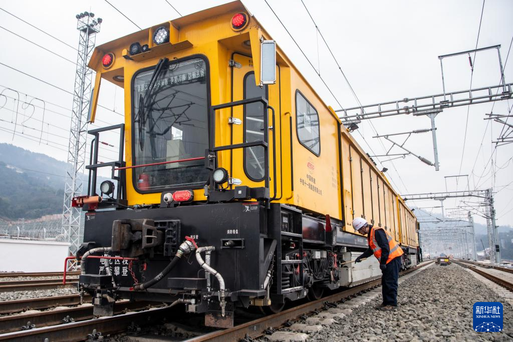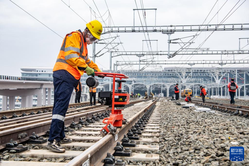 2月18日,在重庆东站建设施工现场,铁路工人在对线路进行精调作业。