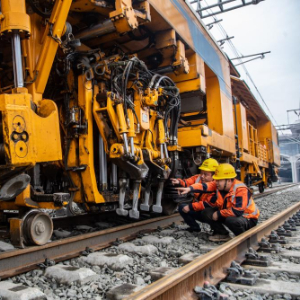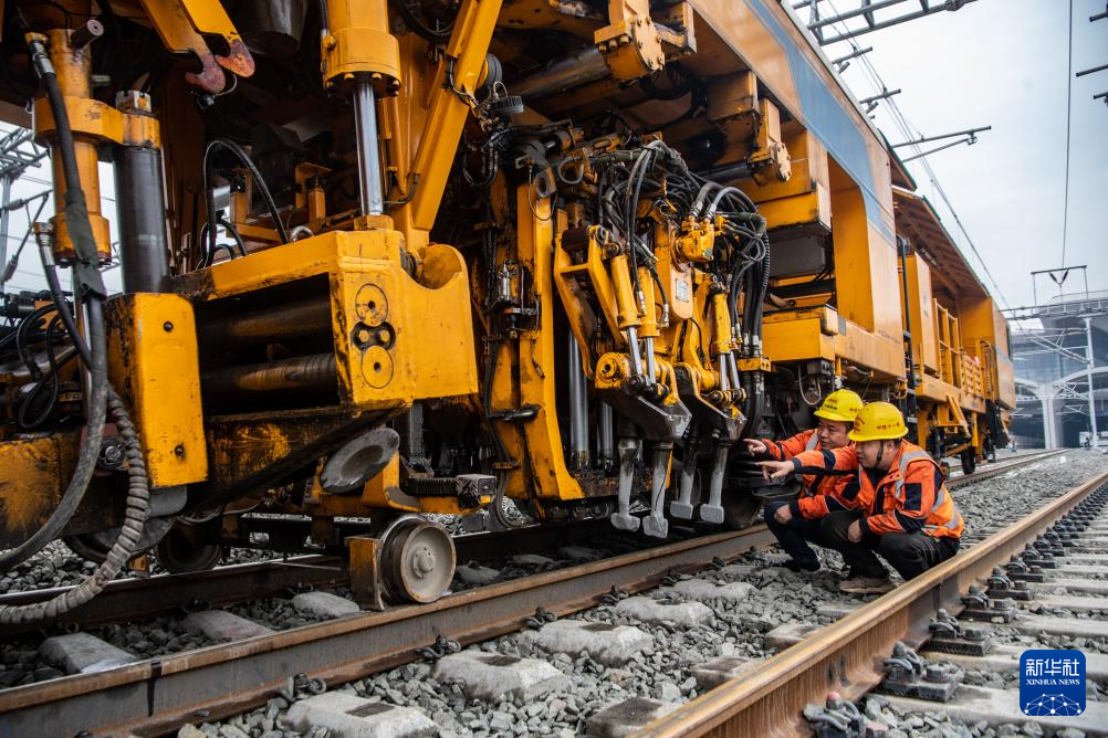 2月18日,在重庆东站建设施工现场,中铁十一局的铁路工人对大机捣固车进行检查。