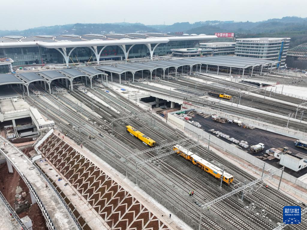这是2月18日拍摄的重庆东站建设施工现场线路精调作业现场(无人机照片)。