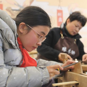 2月18日,在榔桥镇梳乡文化园,研学的学生体验木梳制作。