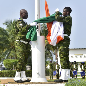 2月20日,在科特迪瓦经济首都阿比让的布埃港,科特迪瓦士兵在军事基地移交仪式上升科特迪瓦国旗。