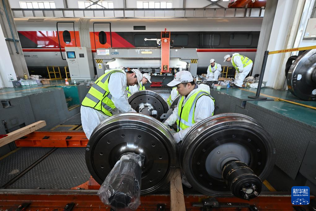 2月25日,工作人员在铁科院国家铁道试验中心对CR450动车组样车进行试验验证时更换轮对作业。