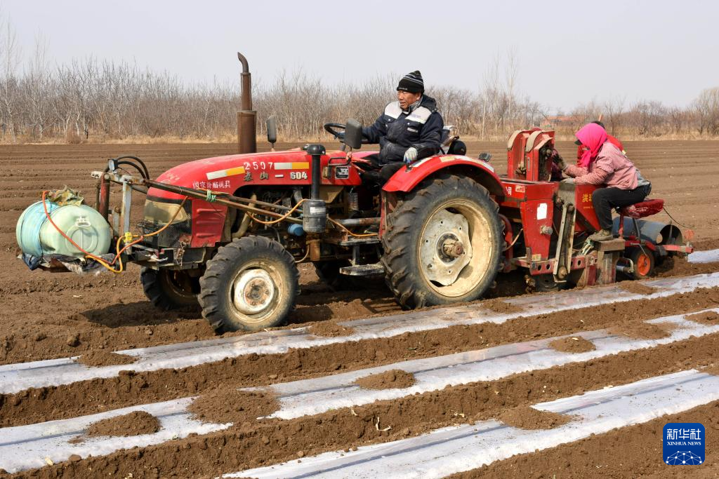 2月25日,山东省青岛胶州市胶东街道斜沟崖村村民在种植马铃薯。