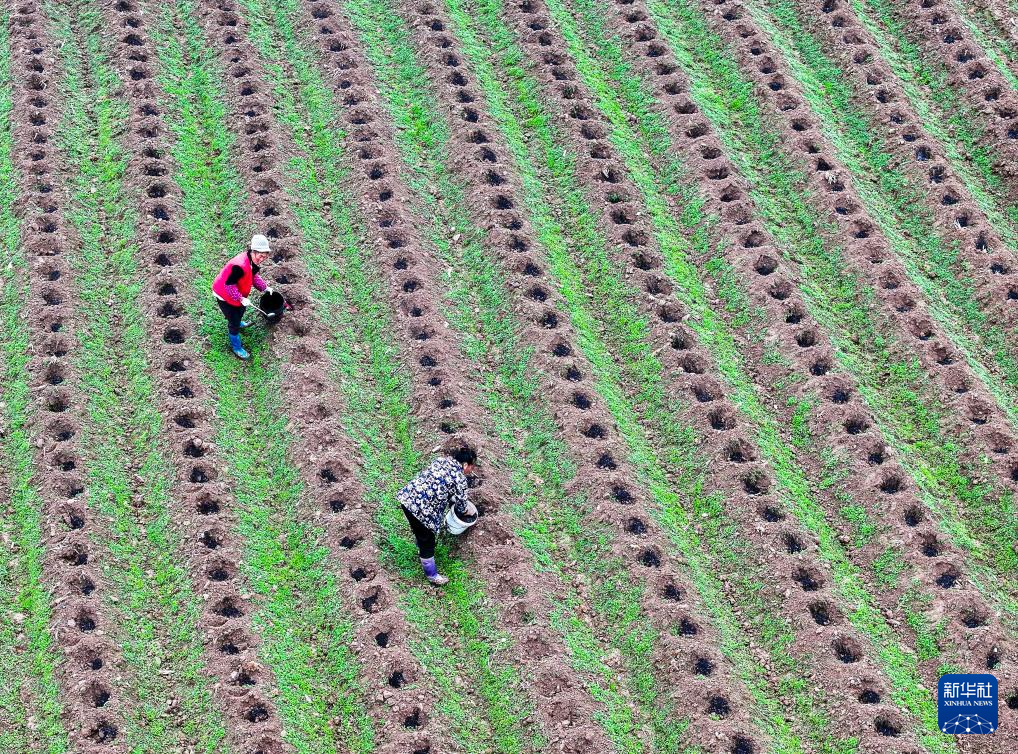 2月24日,在湖南省永州市道县梅花镇宜新村,农民在田间施肥(无人机照片)。
