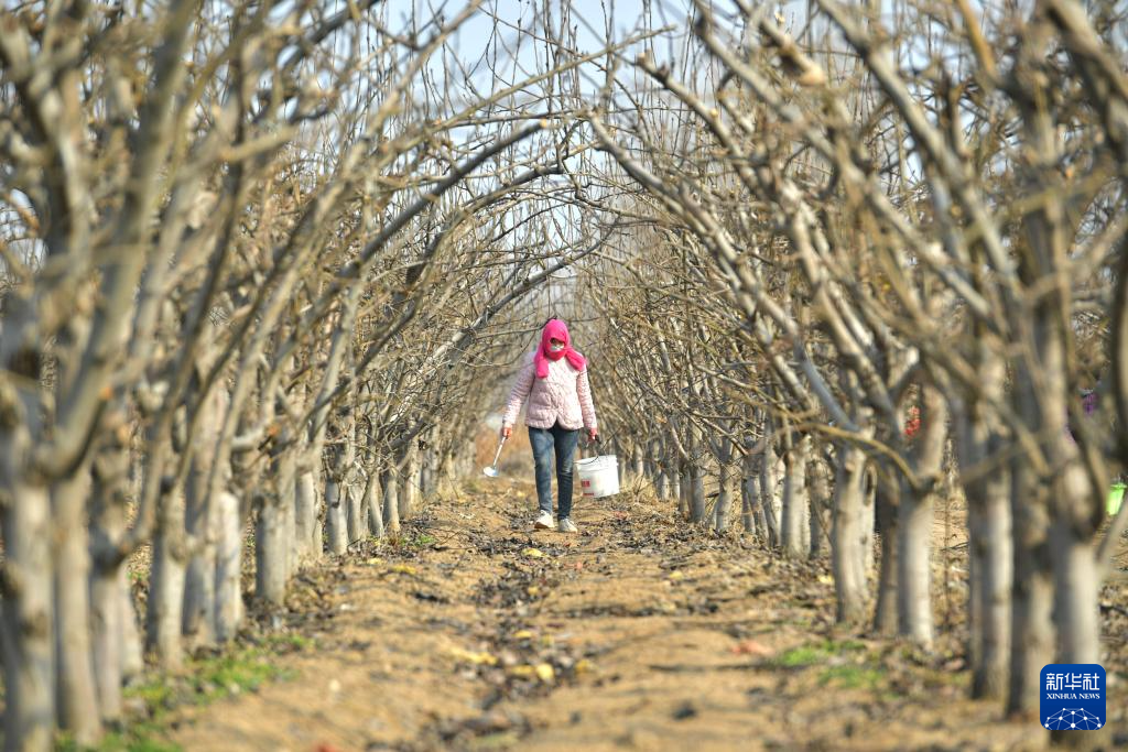 2月25日,在河南省商丘市夏邑县郭店镇王刘庄村,果农在为果树施肥。