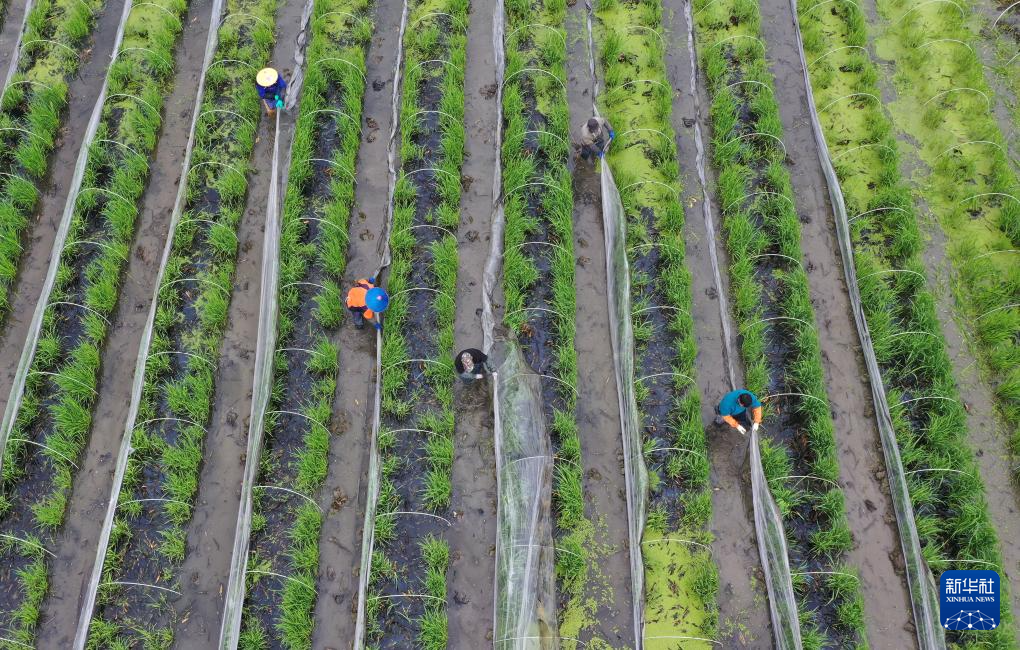 2月25日,在浙江省温岭市新河镇郑洋新村,农户管护茭白苗(无人机照片)。