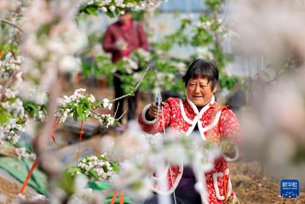 2月25日,山东省枣庄市市中区齐村镇前良村农民给樱桃树人工授粉。