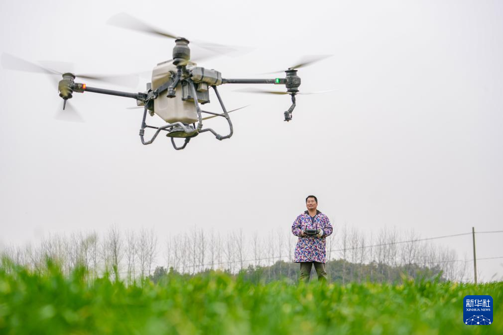 2月25日,在安徽省合肥市蜀山区小庙镇,农民使用植保无人机为小麦施肥。