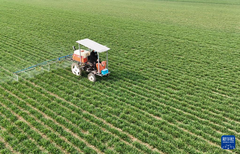 2月25日,河南省平顶山市宝丰县闹店镇农民驾驶植保机械开展病虫害防治作业(无人机照片)。