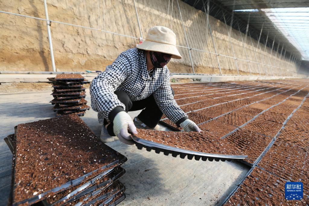 2月25日,在甘肃省定西市安定区内官营镇绿色蔬菜现代产业园内,工人在摆放新育的蔬菜苗。