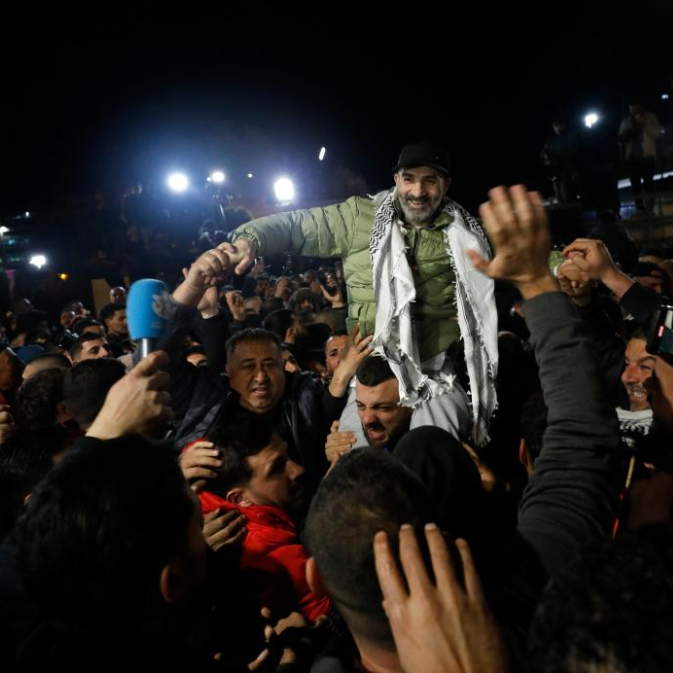 2月27日,在约旦河西岸拉姆安拉,当地民众欢迎巴勒斯坦获释人员回家。
