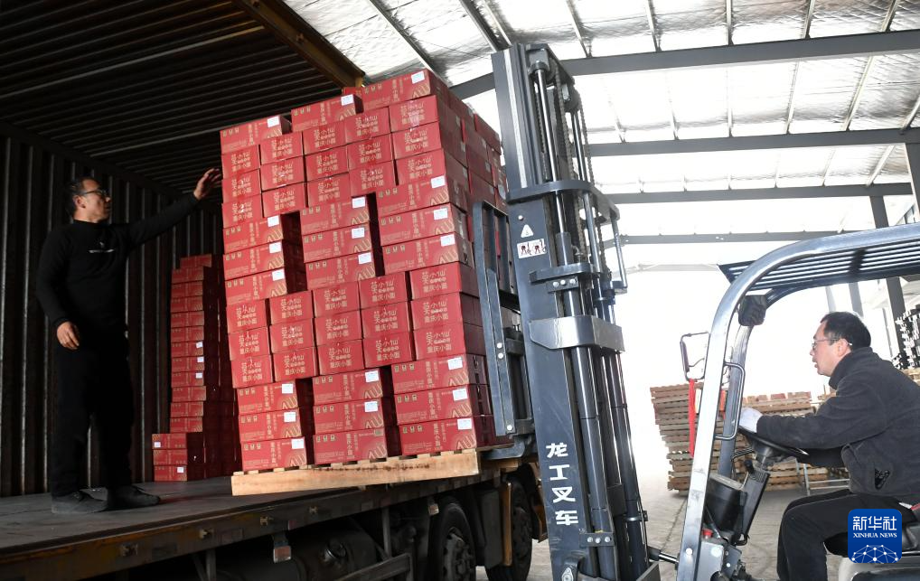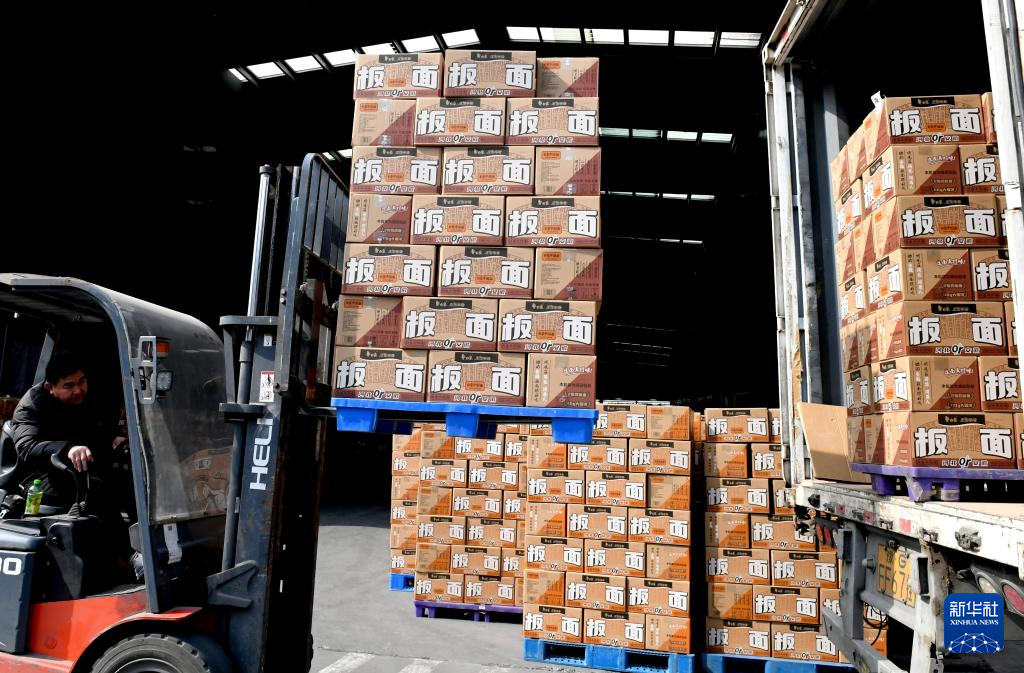 2月27日,工人在河南省温县一家方便速食企业厂区将产品装车外运。