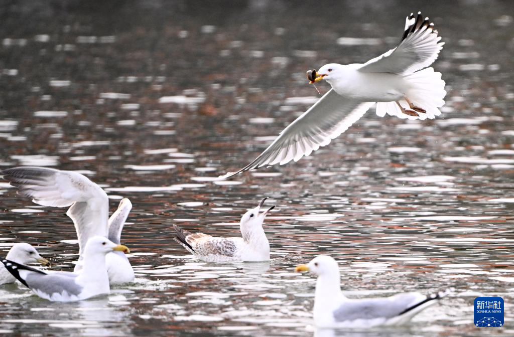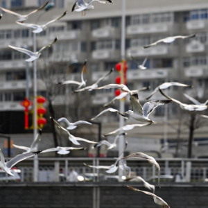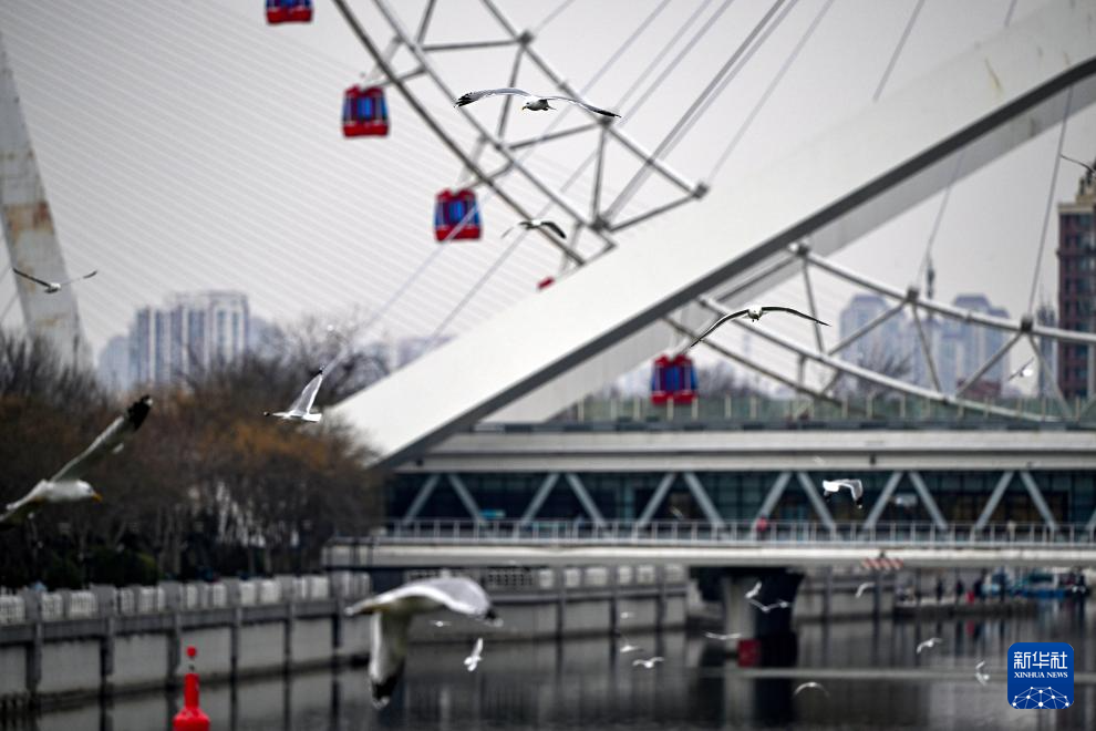 近来,随着气温回暖,大批海鸥在天津市海河沿岸金钢桥附近翔集、觅食。