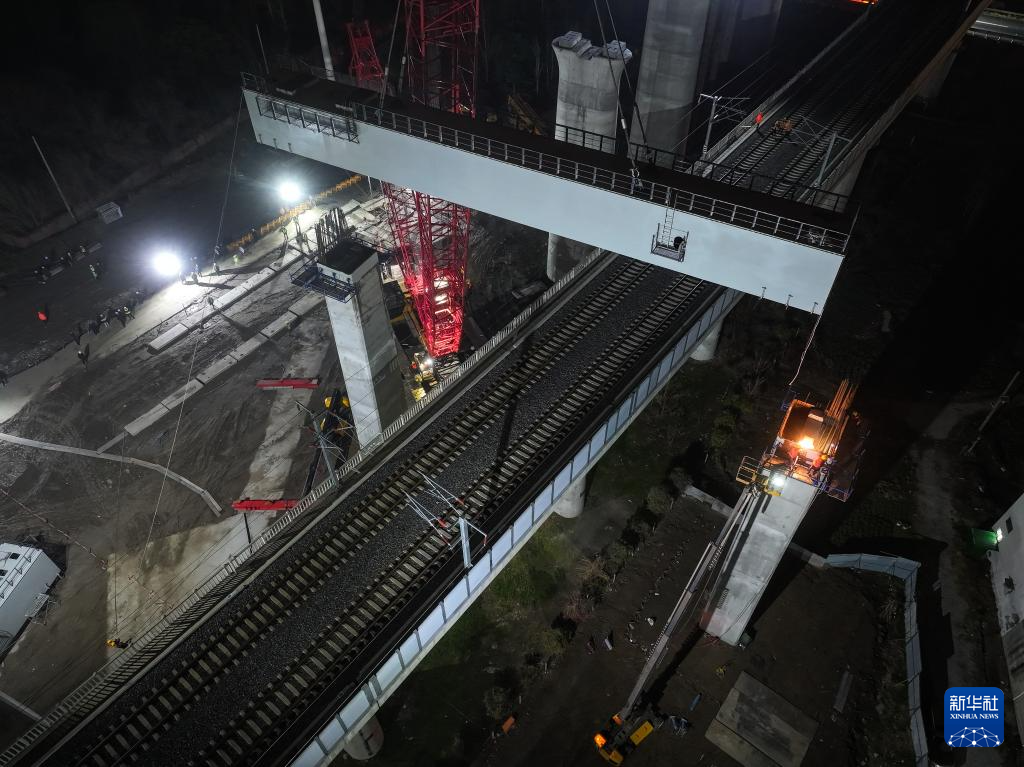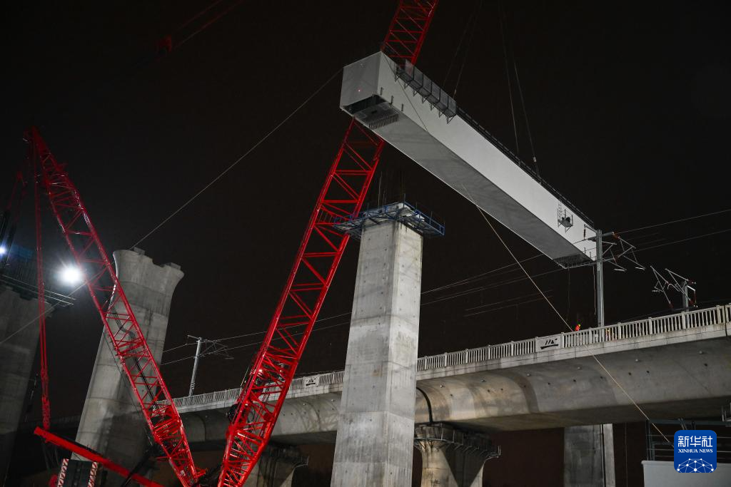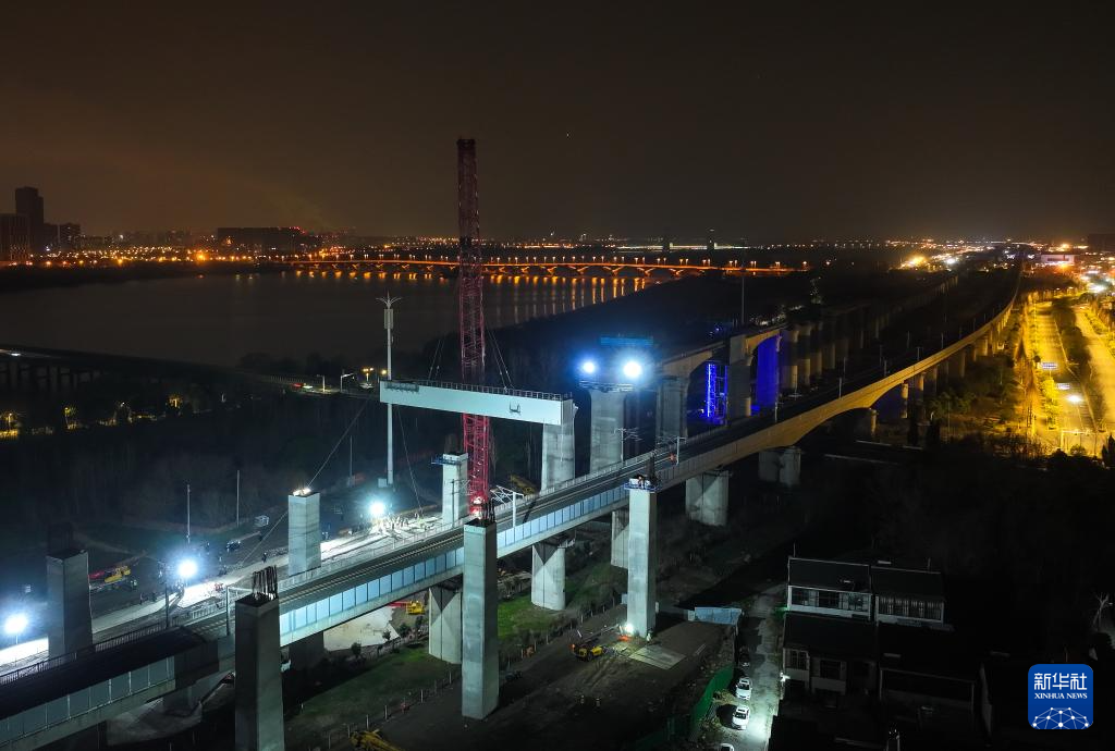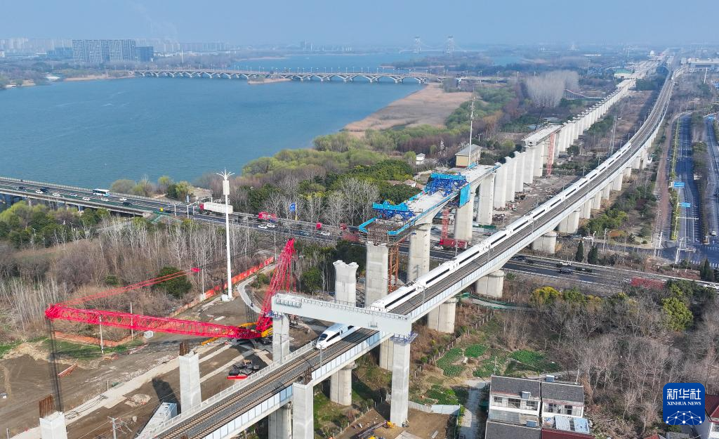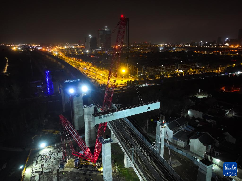 沪宁合高铁跨连镇高铁首跨钢横梁吊装作业现场(3月6日摄)。