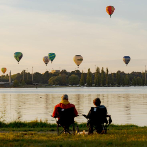 3月18日,人们在澳大利亚堪培拉的伯利·格里芬湖畔观赏热气球。