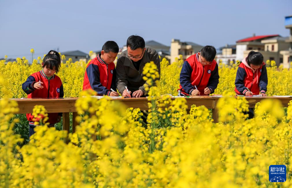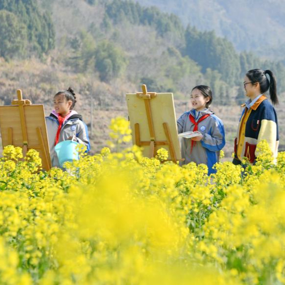 3月20日,学生们在江西省瑞昌市桂林街道常丰村的油菜花田里写生。